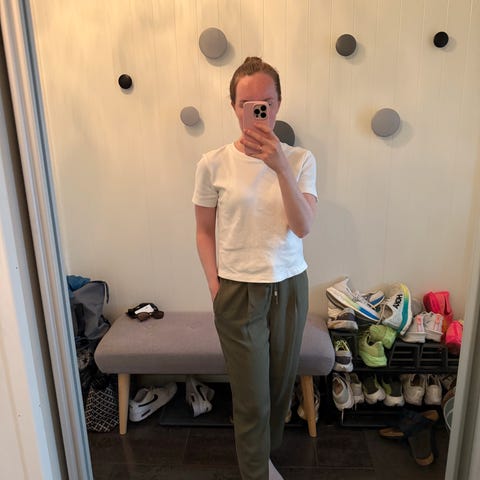 Grønn bukse fra ASOS i størrelse 42, med belte i livet. Buksen heter Peg trousers, se siste bilde for hvordan den ser ut på modell (den på modellen er i en annen grønnfarge og i en annen størrelse)
