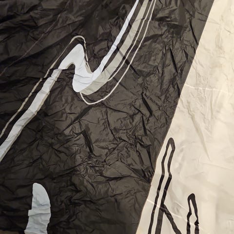 Kite med tverrgående revne i leading edge og hull i leading edge blæren. Kan selvsagt repareres, men selges fortrinnsvis til noen som trenger ripstop-stoff (samme som finnes i paraglidere/telt osv). Duken er crisp.