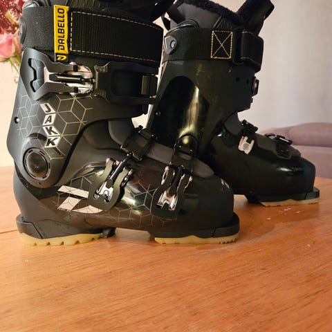 Dalbello Jakk alpinstøvel i svart med rutete detaljmønster. Støvelen har fire justerbare spenner og kraftig powerstrap øverst for god tilpasning rundt leggen. På sålen vises lengden 298 mm. Modellen er egnet til alpint bruk i standard alpinbindinger. Passer for brukere som ønsker en støvel med flere justeringsmuligheter og stabilt skall til kjøring i bakke og park.
