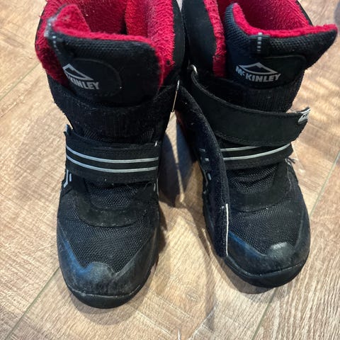 Skoene er svarte med detaljer i mørkegrå og rødt. De har høy skaft for ekstra støtte rundt ankelen og lukkes med doble borrelåser for enkel av- og påkledning. Overdelen er i et robust materiale som tåler bruk ute, og sålen har mønster som gir godt grep på underlaget. Egner seg til bruk i kaldere vær og til hverdags utendørsbruk for barn.