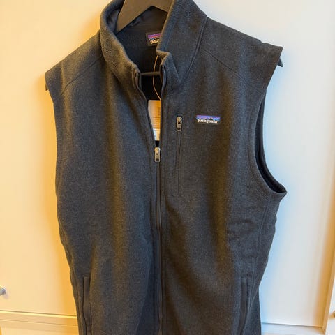 Patagonia fleecevest for herre i størrelse L. Vesten er blå og laget i fleece-materiale. Den har hel glidelås i front, høy krage og glidelåslommer i siden. Egnet som mellomlag eller ytterplagg i mildere vær.