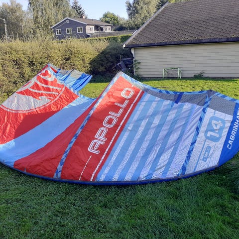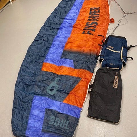 Kite med revne i leading edge. Kan repareres av noen som er handy, men ansees som som delekite og selges helst til noen som trenger rip-stop stoff eller blærer til egne kiter..