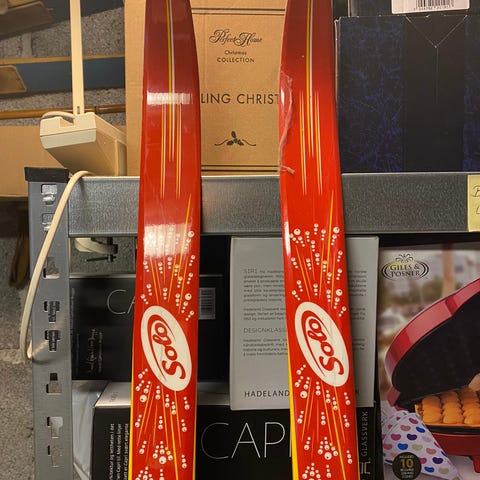 Skipakke med vintage smøreski av tre, 2,10 meter med bindinger. Staver følger med.