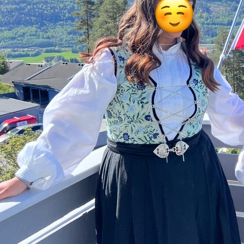 Amalie Norsk Festdrakt med skjorte i 100% bomull. Vest med flott broderidekor, kantebånd i fløyel og sølvfarget snor. Stakk i 50% ull med ekstra sømrom så den enkelt kan reguleres i lengde. Belte med flotte sølvfarget hekter. Festdrakten er i god utførelse og kvalitet og behagelig på. Et godt alternativ til bunad.
