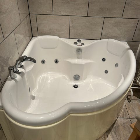 Hjørnebadekar i hvitt. Str. 160cm x 160cm. Ingen skader. Har ikke observert noe bruksmerker heller. Usikker på alder, men ser veldig pent brukt ut.