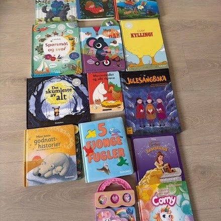 Blandet lot med barnebøker for småbarn. Pakken inneholder flere ulike titler i forskjellige formater og størrelser, både bildebøker og lese-/høytlesningsbøker. Bøkene har varierte temaer og illustrasjoner som passer for barn i barnehage- og tidlig skolealder. Egner seg til høytlesning hjemme eller i barnehage, og gir et utvalg historier samlet i én pakke.