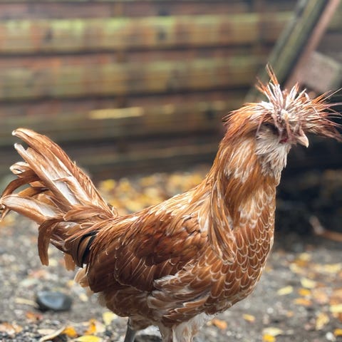 Han er 3 år gammel, utrolig snill med damene sine og passer på alle til enhver tid. Finnes ikke aggressiv mot verken folk eller dyr. Lar hønene krype under vingen sin om natta ❤️