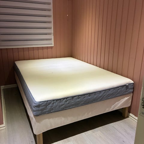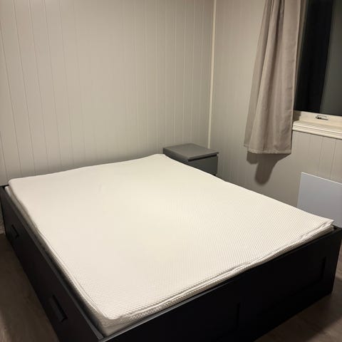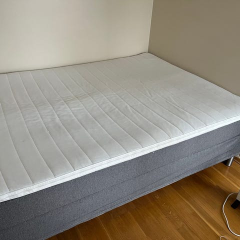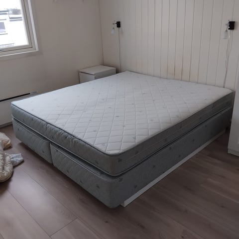 Jysk seng i grå tekstil. Sengen har rette, runde ben i metall og en enkel, moderne ramme. Overmadrass og madrass følger med etter avtale med selger. Passer som fast seng på soverom eller som gjesteseng. Nattbord på bildet er ikke en del av sengen med mindre annet er avtalt med selger.