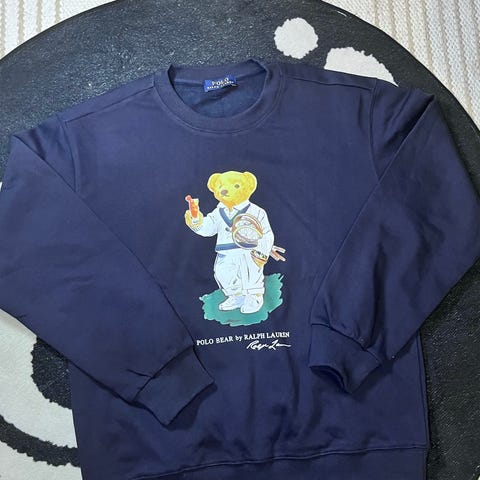Ralph Lauren genser i størrelse M for menn. Genseren er grå og laget av bomull. Den har rund hals og ribbestrikkede kanter på ermer og nederkant. På forsiden er det et motiv av en bjørn i sportsklær med racket og flaske. Passer til hverdagsbruk og fritid i kjølig vær.