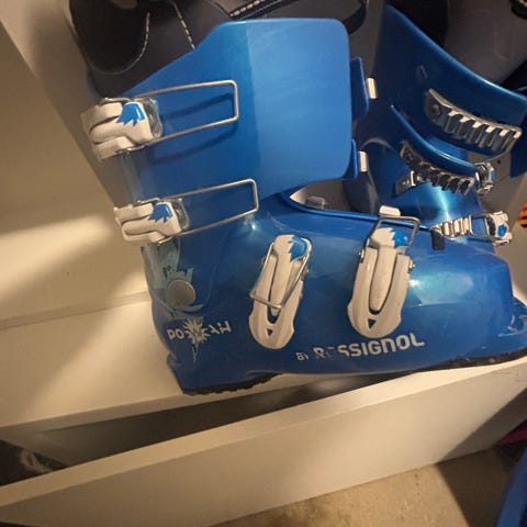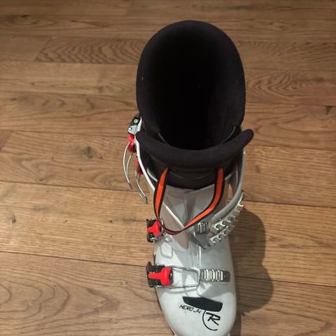 Rossignol skistøvler i størrelse 24,5 (288 mm sålelengde). Passer størrelse 37. Skistøvlene er i hvit farge med justerbare spenner i metall og rem øverst for bedre tilpasning rundt leggen. Modellen har plastskall med innerstøvel som gir støtte og komfort til alpinkjøring. Passer til vanlige alpinbindinger.
