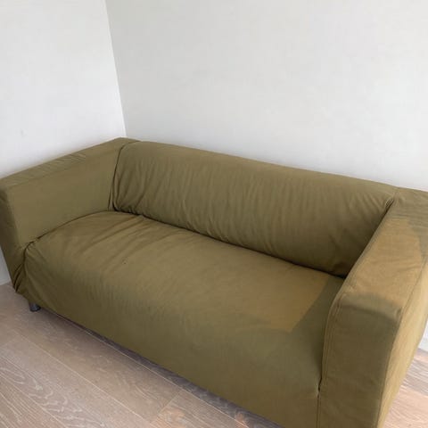 Sofaen har et hull på baksiden og enkelte bruksmerker etter ca. 25 år, men den har holdt seg utrolig godt etter alle de årene, flere av dem med små barn i hus. Kan trenge en liten runde med sofarens, men vi har ikke opplevd flekkene som sjenerende.