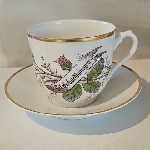 Gammel Porsgrund porselen stor bursdagskopp. Koppen er hvit med flerfarget blomster- og bladdekor samt tekstbånd med påskrift "Til geburdtsdagen".