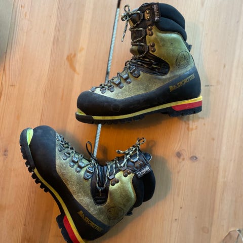 La Sportiva fjellstøvler i størrelse 44,5. Støvlene er laget i skinn med kraftige gummiforsterkninger rundt tå og hæl. Overdelen har solid snøresystem med metallkroker og -hemper for god tilpasning rundt fot og ankel. Ny yttersåle har grovmønstret for godt grep på variert underlag. Og er resålet slik t stegjern sitter godt. Modellen er laget i Italia og er egnet som fjell- og turstøvel til herre.
