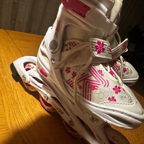 Supreme barneskøyter i grå og lilla med blomsterdetaljer. Modellen har hard yttersko i plast med justerbare spenner og borrelås for enkel tilpasning. Myk, polstret innersko gir støtte rundt ankel og fot. Skøytene har fastmontert stålklinge egnet for bruk på isbaner og uteis. Passer til barn som trenger stabile skøyter til lek og enkel skøytegåing.