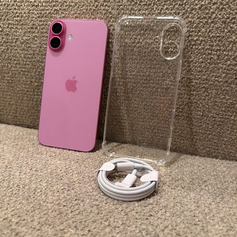 Apple iPhone 16 mobiltelefon med 128 GB lagringskapasitet. Telefonen har rosa bakside med to hovedkameraer og LED-blits. Skjermen dekker hele fronten med flat design. Egnet for daglig bruk som surfing, sosiale medier, foto, video og apper. Leveres etter bildene, med tilhørende rosa deksel dersom dette er inkludert av selger.