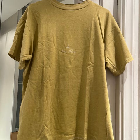 Samsøe Samsøe t-skjorte for herre i størrelse XL. T-skjorten er gul og laget av bomull. Norsbro 6024. Den har korte ermer og rund hals, med enkel logo-/tekstdetalj på brystet.