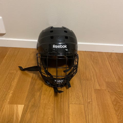 Reebok 3K ishockeyhjelm i størrelse M. Hjelmen er svart og har metallgitter foran for ansiktsbeskyttelse. Justerbar hakestropp og justeringsmuligheter på siden for tilpasning til hodestørrelse. Egnet til bruk i ishockey og annen skøytesport der hodebeskyttelse kreves.
