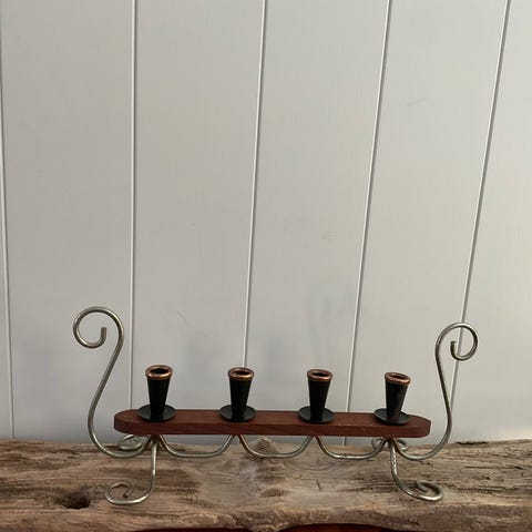 Flott svensk 1950 talls lysestake/vegghengt.Justerbart system som følger lysets størrelse..Teak,messing(virker som den er lakket/malt svart.usikker da arvet denne.Kan sikkert fjernes hvis ønskelig.amen fin stand/og stilig.bud