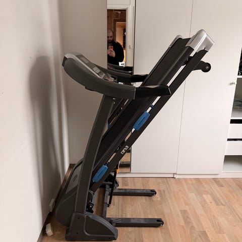 Kayoba tredemølle i grå utførelse. Tredemøllen har elektronisk betjeningspanel med display og flere knapper for justering av hastighet og treningsprogrammer. Løpebåndet har markeringer langs sidene. Egnet til innendørs kondisjonstrening og gange eller løping hjemme. Maskinen har sikkerhetsnøkkel på konsollen for stoppfunksjon under bruk.