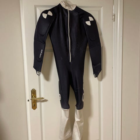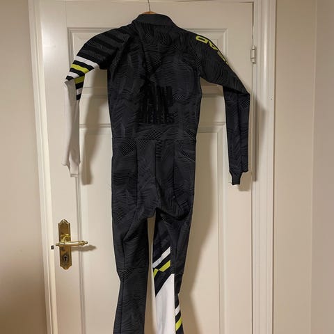 Phenix skidress i heltrukket modell med glidelås foran. Dressen har geometrisk mønster i flere farger, med hovedtoner i blå, grønn og gule nyanser. Størrelse 14, ifølge innvendig merkelapp. Egnet som racing- eller treningsdress til alpint eller annen skisport.