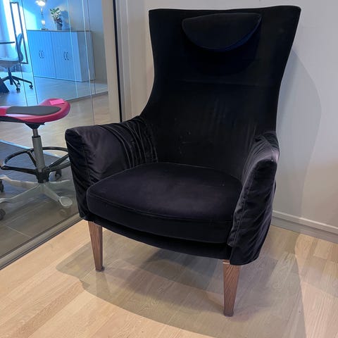 Stolen har et enkelt og stilrent design i tre med svarte metallben – passer perfekt som ekstra stol, pynte stol eller til en liten leseplass. Pent brukt og i god stand, men et par bruksmerker her og der ☺️