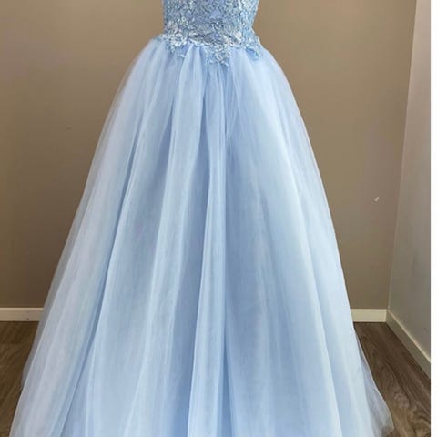Alexandra Ritzi festkjole i tyll i blå farge, størrelse M. Kjolen har figurnært liv med dekorative blomster- og perledetaljer på overdelen. Skjørtet er i flere lag tyll som gir volum. Modellen har off-shoulder-utringning og snøring i ryggen for justerbar passform. Egnet som festkjole til formelle anledninger som ball, skoleavslutning eller andre høytidelige arrangementer.