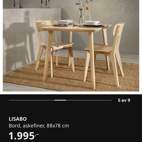Selger et pent brukt rundt spisebord fra IKEA, modellen heter Lisabo. Kjøpt nytt for litt under tre år siden. Pent brukt, ikke spist altfor mange måltider ved dette bordet. Ingen umiddelbart synlige bruksmerker men selges som det er.
