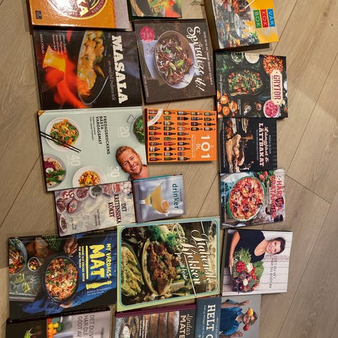 Rydder i hyllene her og selger noen av mine kjære kokebøker :) 100 kr stk. Betales med vipps (100 nok + porto).