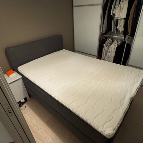 150 x 200 VERMA seng fra Jysk gis bort mot henting. Nattbord fra IKEA følges med om ønskelig.