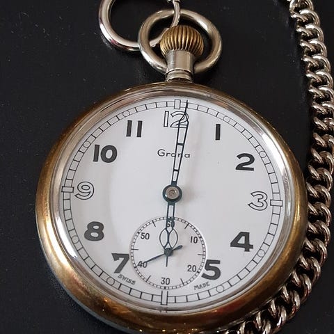 Nydelig patina på denne. Fungerer utmerket. Bare å dra opp. Med tilhørende kjede. Denne har vært lenge i familien. Kan ikke huske når den havnet i mitt eie. Ser ut som noen har gravert "Joy" på baksiden, og at noen har forsøkt å risse over dette. Så det er nok noen gode historier som følger med denne.