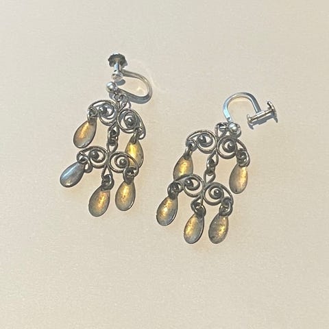 Nydelige, blomsterformet øredobber i oksidert sølv med tradisjonell filigrandekor og små, blanke dryppløv.