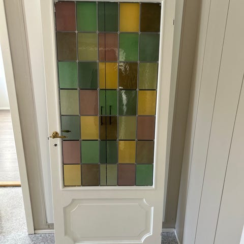 Selger 2 pene blyglassdør/ Innerdør med farget strukturglass. Døren har klassisk profilert ramme i tre og glass med strukturert overflate i ulike farger som grønn, blå, gul og brun. Glasset slipper inn rikelig med lys samtidig som det gir god innsynsskjerming. messingfarget dørhåndtak og innfelte beslag/låskasse. Passer som innerdør mellom rom der man ønsker lysgjennomgang samtidig som glasset skjermer noe for innsyn.