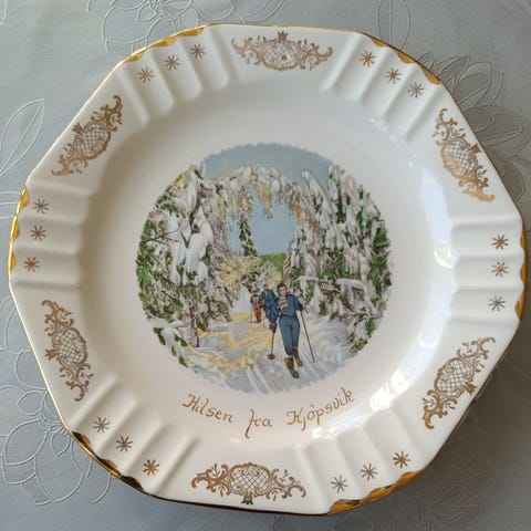 Dekorativ samlertallerken fra serien Norske Skuter produsert av Figgjo Norway. Motivet viser galeasen Debora, et norsk frakteskip fra 1872, omgitt av klassiske maritime symboler som anker, ratt og kanoner. Sepiatrykket på varm gul glasur gir et flott vintage og maritimt uttrykk.
