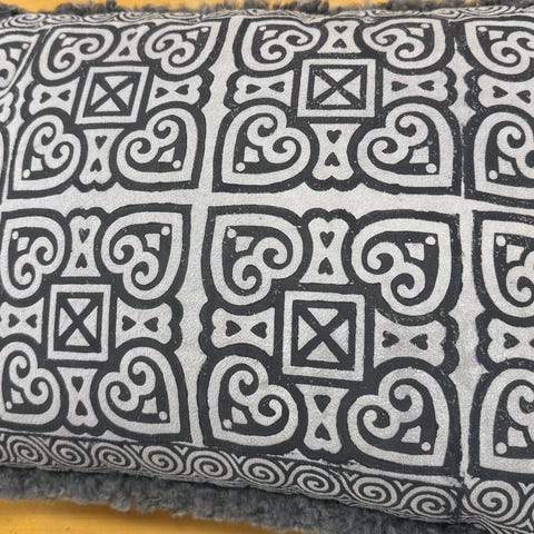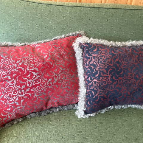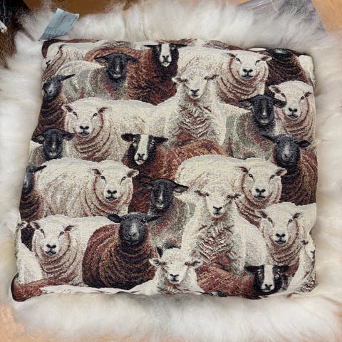 Håndsydd Skinnpute sydd med voksa lintråd. Innerpute i naturfyll som dun og fjær. Str 50x50. Front i gobelinstoff i blomstermønster. Bakside i svart villsau.
