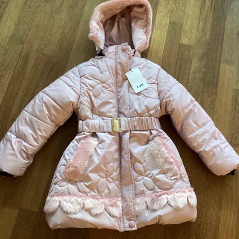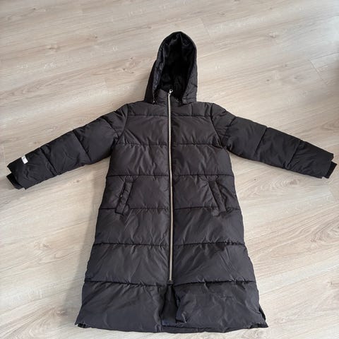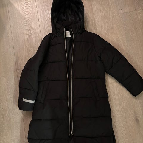 Lindex vinter jakke for jente i størrelse 140. Jakken er svart og laget i polyester. Den har hette, gjennomgående glidelås foran og glidelåslommer i siden. Nederst på sidene er det trykknapper for justering av vidde. Ifølge merkelappen er materialet vannavvisende (water repellent). Sydd refleks på armen og på baksiden.