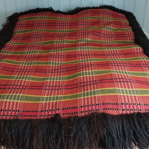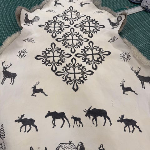 Skinnfell/saueskinn av norsk pelssau i grått med trykk.