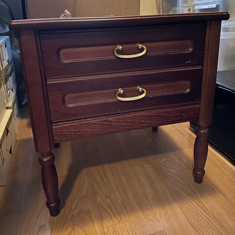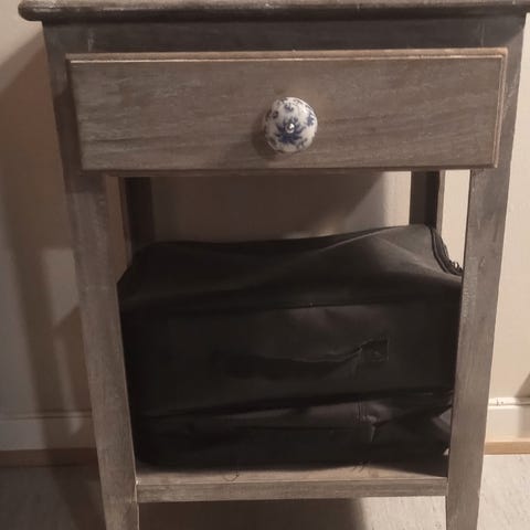 Kan brukes som nattbord. Har liten skade, se bilde. Skuffen fungerer og ben er i god stand.