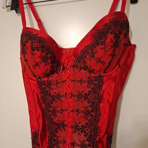 Korsett, rødt med sorte blonder- pirrende flott!