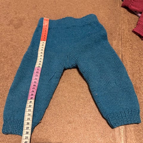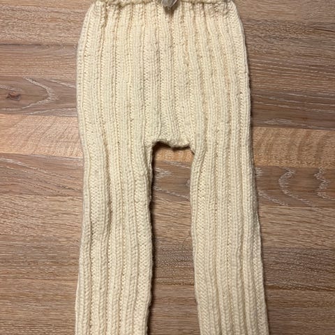 Strikket ullbukse i fargene lilla, hvit, grå og rosa. Strikk i livet som enkelt justeres ved å knyte strammere eller slakere. Pent brukt. Kan vaskes i maskin på ullprogram. Ca str 74/80.