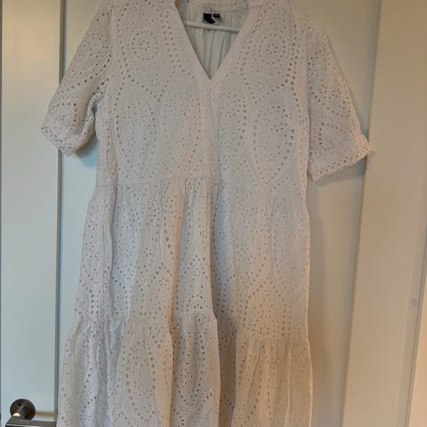 YAS sommerkjole for dame i størrelse L. Kjolen er hvit og laget i bomull. Den har broderie anglaise-lignende hullmønster, korte ermer med kantdetaljer og v-utringning med knyting i nakken. Skjørtet er sydd i flere volanger for et lett og luftig uttrykk. Passer som sommerkjole til hverdagsbruk eller enkle anledninger.
