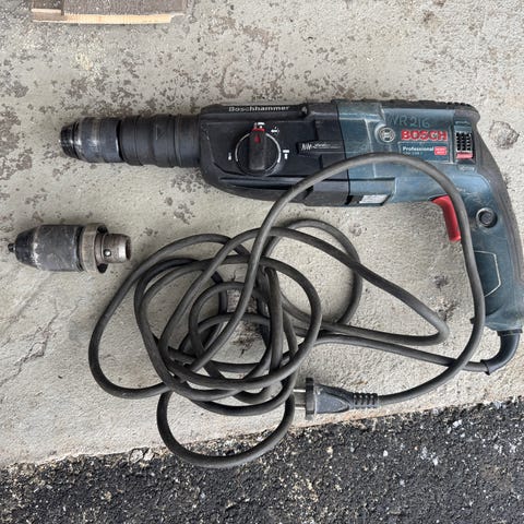 Bosch GBH 2/20 REA borhammer med 500 W motor. Maskinen er ledningsdrevet og har slagfunksjon for boring i betong, stål og tre. På typeskiltet fremgår det anbefalte borediametere for ulike materialer. Egnet til vanlig bore- og meislearbeid der det trengs en kompakt borhammer med SDS-feste (basert på modellbetegnelsen).