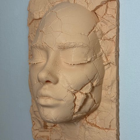 Veggskulptur med ansikt i relief, i svart matt farge. Motivet viser et lukket ansikt med sprekkstruktur i overflaten. Skulpturen er rektangulær og mål vises på de siste bildene. Egnet som veggdekor i for eksempel stue, gang eller soverom. Materiale er PLA+. Monteres flatt mot vegg. Designet er unikt digitalt skulptert og finnes ingen annen plass.