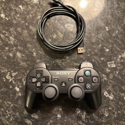 Sony DualShock 2 kontroller med kabel i svart farge.