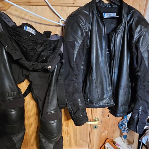 Div. motorsykkelklær. Alle jakkene har ryggplate og albu-/skulderpolstring. Buksen har hoft og knebeskyttelse. Str. står på bildene. Kom med bud!