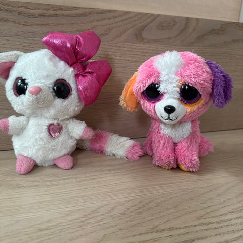 kosedyr små i mykt plysjmateriale. Figuren til venstre er en liten hund med store øyne og flerfarget pels i gult, rosa og hvitt. Figuren til høyre er en rund, turkis plysjfigur med store øyne og gullfargede detaljer. Passer som samlefigurer, pynt på barnerom eller som myke leker for barn.