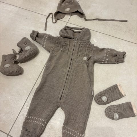 Lillelam heldress med tilhørende lue og tøfler i brun farge, størrelse 56, unisex. Heldressen har glidelås foran, oppbrettbare ermer og ben samt strukturstrikket mønster øverst. Lua har øreklaffer, knytebånd og dusk på toppen. Tøflene har snøring rundt ankelen og strukturert såle. Settet passer til baby og kan brukes både inne og ute som et ekstra lag etter behov.