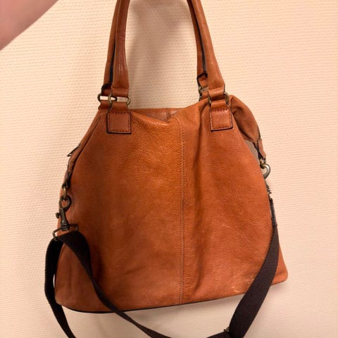 Vesken er pent brukt og i god stand. Normal slitasje i læret som gir den karakter, ingen skader. Glidelås og reimer fungerer som de skal.