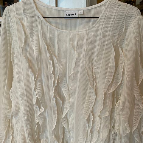 KappAhl topp for dame i størrelse M. Toppen er rosa og laget i polyester. Den har lange ermer og rund hals. Stoffet har en strukturert overflate med dekorative detaljer som gir et lett glansfullt uttrykk. Passer som pen topp til ulike anledninger.