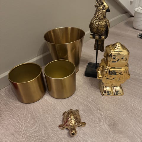 Dekorasjonssett med flere metallgjenstander i gullfarge selges samlet