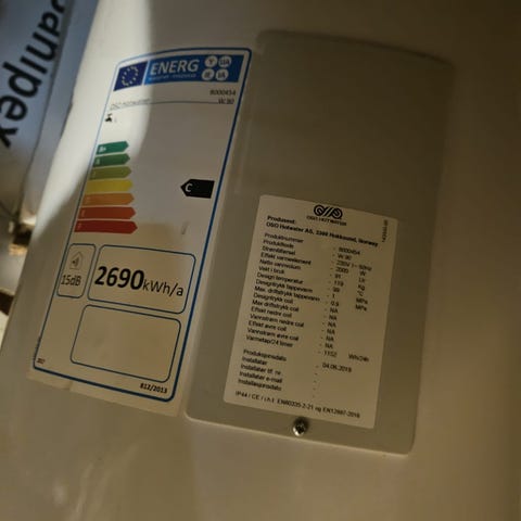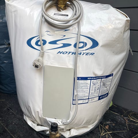 OSO Hotwater varmtvannsbereder i stående utførelse. Enheten er sylinderformet og har ytre kledning i lys blå farge. På merkeskiltet finnes informasjon om tilkoblingspunkter for kaldt og varmt vann samt drifts- og sikkerhetsinstruksjoner.